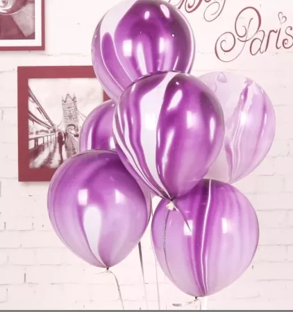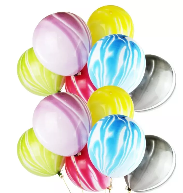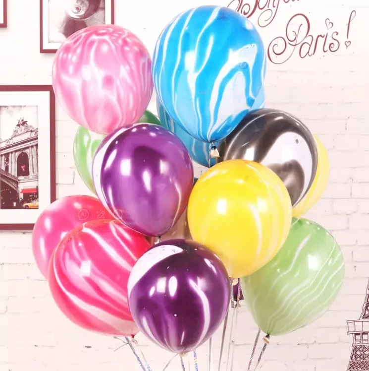 Låt mig presentera det för vänner som inte känner till det. Agatballonger är latexballonger med naturliga marmormönster på ytan. De ser lika high-end som verkliga agat ädelstenar. Mönstren för varje ballong är unika, och de kommer att visa en särskilt charmig lyster under ljuset. De varor vi importerade denna gång inkluderar mer än ett dussin avancerade färger som vinröd, mörkgrön, bärnsten, pärlvit, etc.