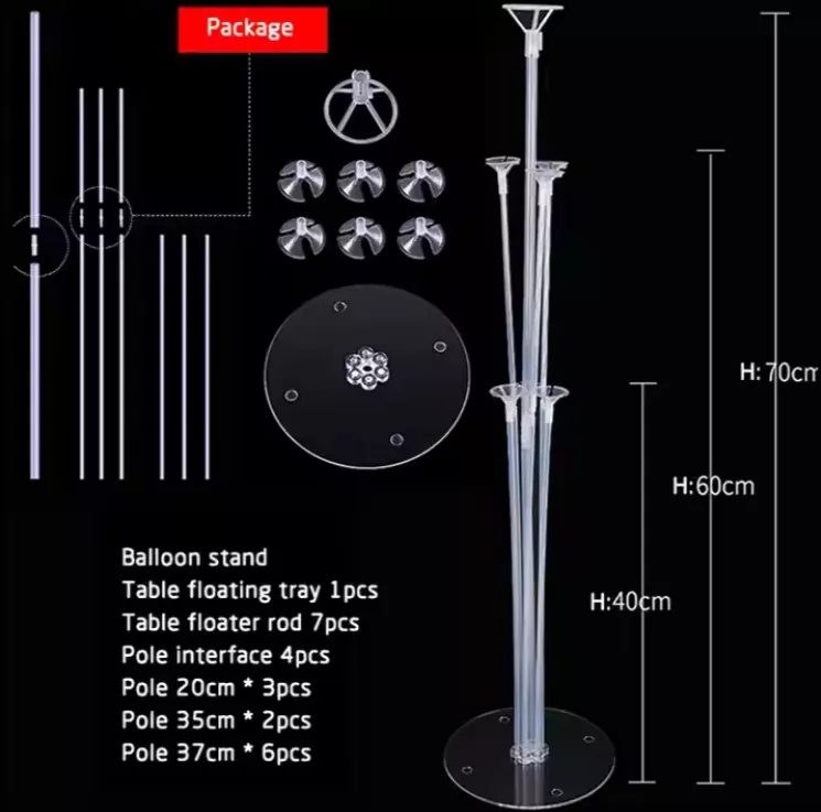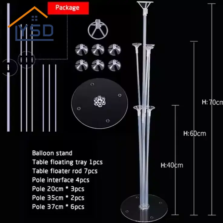 Ballonghållare är vanligtvis transparent. Ballonger som staplas tillsammans tenderar att se styva ut. YSD: s transparenta ballonghållare är inte bara en höjd. Det finns olika längder i en uppsättning ballonghållare. Till exempel är den bästa vi säljer en kombination av 70 cm, 60 cm och 40 cm. Det finns en 70 cm, 3 60 cm och 3 40 cm. De kombineras med ballonger för att göra ballongerna spridda och ordnade. Denna "förskjutna" effekt uppnås helt genom dessa transparenta stativ av olika längder.
