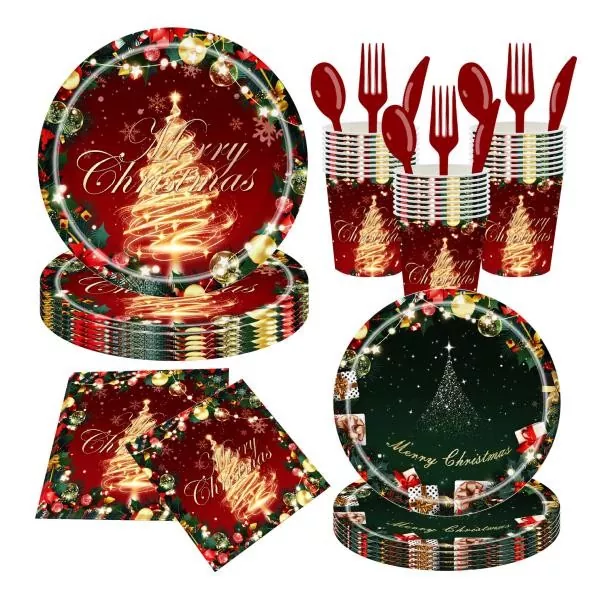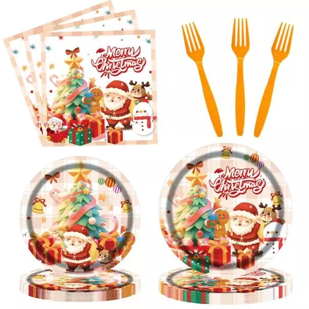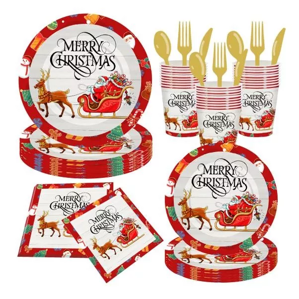 Säkra och pålitliga material är viktiga. Högkvalitativa julavgångar ser ofta tillverkade av livsmedelskvalitet PP-plast eller tjock, hållbar gjuten massa, som är giftfri, luktfri och säker för att hantera varm eller kall mat. Ytan är noggrant tryckt med livliga, hållbara julmönster, vilket säkerställer en festlig atmosfär från det ögonblick som bordet är inställt till slutet av måltiden. Uppsättningen innehåller en komplett och matchande uppsättning komponenter - en huvudplatta, dessertplatta, bestick, gaffel, sked, dryckskopp och servetter - allt i enhetliga storlekar, redo att använda direkt ur lådan, vilket eliminerar behovet av ytterligare matchning, vilket sparar betydande tid under partiberedningen. Designen betonar praktiska, med upphöjda fälgar för att förhindra spill, gafflar och skedar för ett bekvämt grepp, och papperskoppar som står ordentligt, vilket säkerställer en smidig och trevlig måltid.