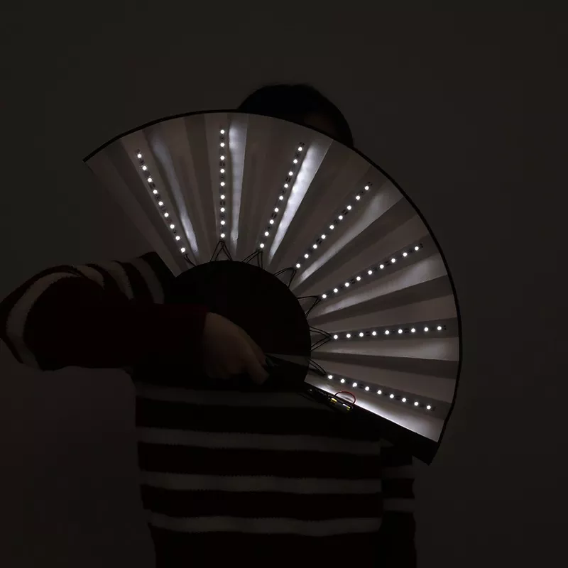 Så du är mitt på dansgolvet. Beatet sjunker och du snärtar med handleden – fläkten tänds direkt. Mjuka regnbågsvågor, ljusa blinkande mönster – det förändras med ditt humör. Det är inte bara praktiskt; det är en del av din stämning. Sväng den till rytmen och du målar luften med ljus. Alla märker det.