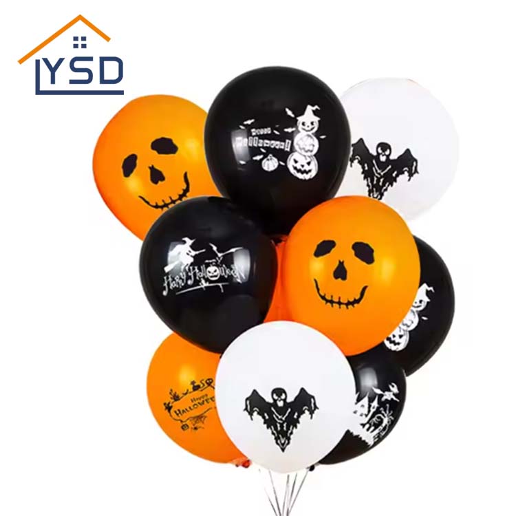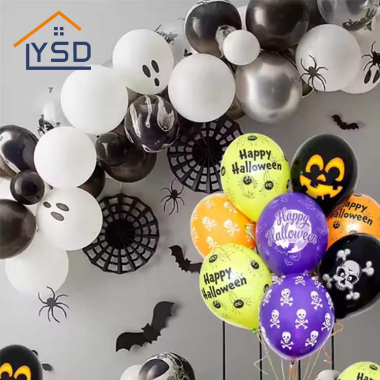 Halloween Latex -ballonger finns i svarta, vita, orange och andra färger som matchar Halloween. De är gjorda av naturlig latex. De används främst för att dekorera Halloween -fester och öka den festliga atmosfären. YSD är en fabrik som specialiserat sig på produktion av partiförsörjning. Materialen som används vid produktionen av ballonger är alla i linje med standarderna.