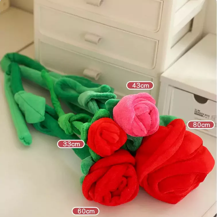 Denna "Rose Bouquet Plush Toy" är noggrant utformad. Varje "blomma" är faktiskt en mjuk, bedårande liten plyschleksak, mjuk och behaglig att ta vid, och den är luddfri och allergifri. Den är bunden med simulerade gröna löv och omslagspapper, vilket ger den samma atmosfäriska utseende som riktiga blommor, men den är mycket mer hållbar och kan hålla i flera år! Och den finns i en mängd olika färger – rosa, röd och taro lila – var och en är så lugnande och kommer att fängsla alla tjejer.