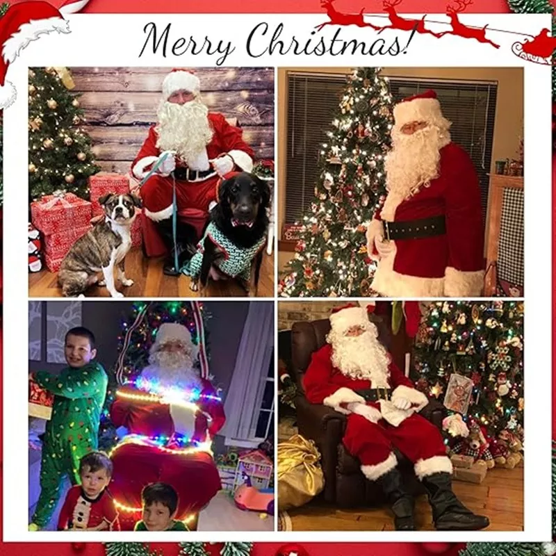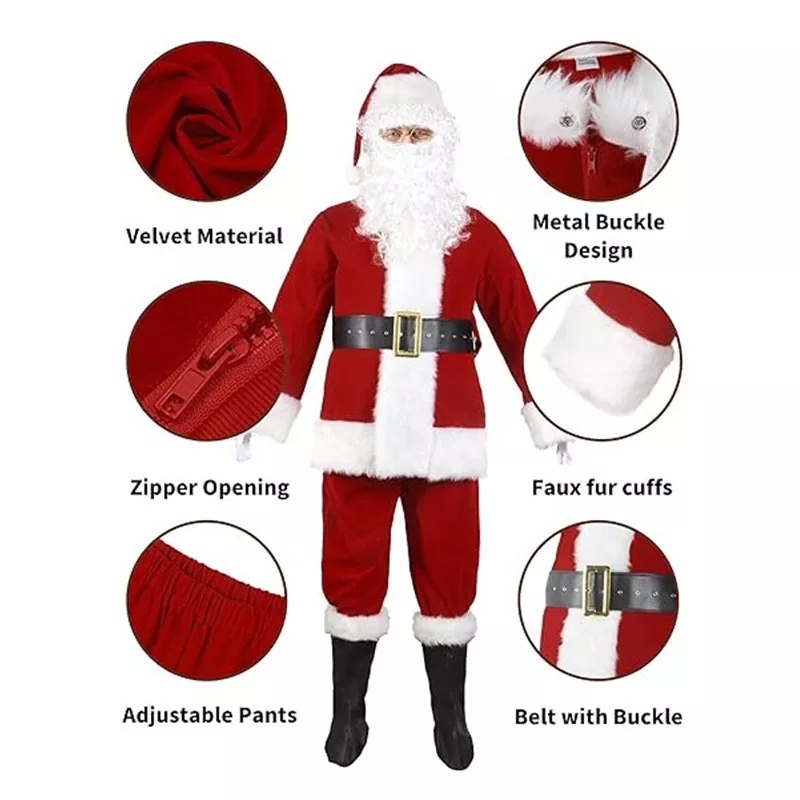 Denna jultomtendräkt är utformad från mjukt, bekvämt polyestertyg, vilket erbjuder utmärkt andningsförmåga och värme, vilket säkerställer värme och komfort under vinteraktiviteter. Kostymens design behåller det klassiska röda och vita färgschemat, accentuerat av fluffiga vita hems och ett svart bälte, vilket skapar en slående visuell inverkan med intrikata detaljer. Dräkten kommer också med en matchande hatt och skägg, vilket gör det enkelt att bära utan ytterligare tillbehör.